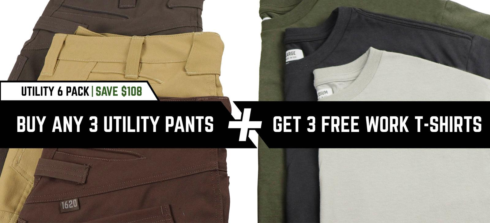 Add any 3 Utility Pants and any 3 NYCO Work T-Shirts to your cart and the TEES ARE FREE. That's over $100 in savings on an American Made wardrobe upgrade - Guaranteed for Life - that'll work as hard as you do. Shop below, build your bundle, and get after it.