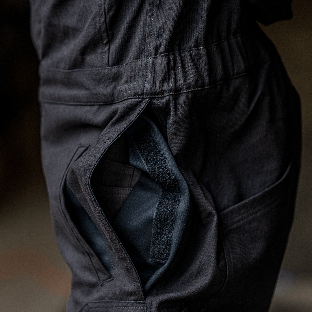 The coverall features plenty of storage. An overbuilt access pocket, with industrial velcro closure, deep front welt pockets, angled back pockets and side utility pockets.
